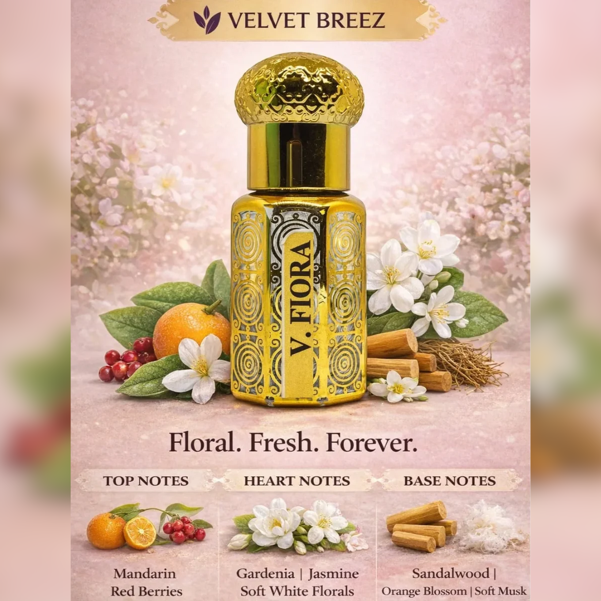 Velvet Flora is a graceful floral perfume crafted for those who love soft freshness blended with timeless elegance. Inspired by blooming flowers and gentle warmth, this fragrance opens fresh, blossoms beautifully, and settles into a smooth, comforting trail that lasts all day.